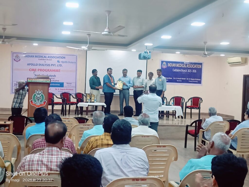 Apollo Dialysis Clinics, in association with the Indian Medical Association (IMA) Cuddalore, conducted a Continuing Medical Education (CME) programme focused on Chronic Kidney Disease (CKD) awareness, early detection, skin care, proteinuria, and caregiver guidance. The session was held at IMA Hall, Beach Road, Cuddalore, and saw active participation from over 50+ doctors from the Cuddalore and Puducherry regions.
